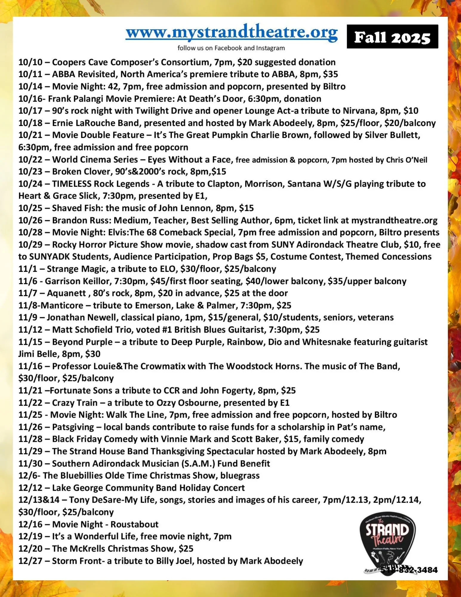 The Box Office is also open for ticket sales during any Strand event. *We accept cash or checks only at the Strand Box Office.